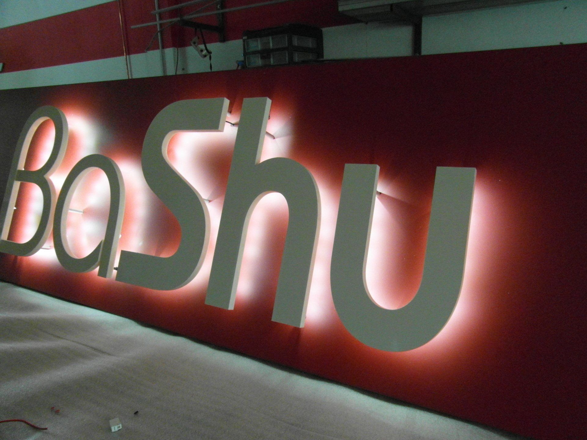 Indirekt leuchtende Buchstaben mit einer von hinten strahlenden Aura.